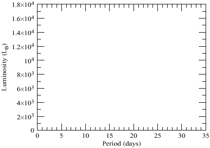 Plot these Cepheids on the above graph of Luminosity versus Period. Draw a straight line as fairly as you can through the the origin and through the h & c Cepheids (the line will not pass exactly through all the points because there are observational and other errors and uncertainties in the precise positions of the points). The straight line expresses graphically the proportionality