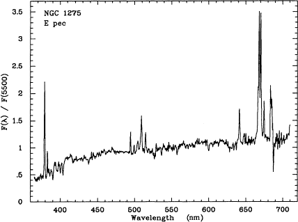 This is the observed spectrum (Kennicutt 1992) of NGC 1275, also known as Per A, the central galaxy in the Perseus cluster of galaxies. The name Per A is because it's the brightest radio source in the Perseus constellation.