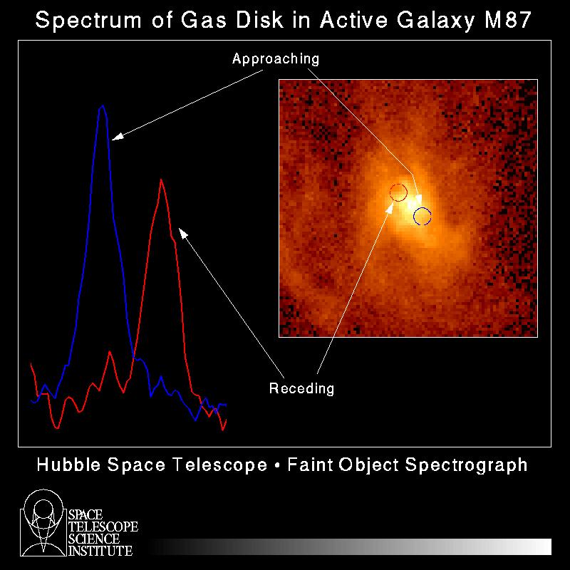 The mass of the black hole at the center of M87 has been measured to be 6.6 ± 0.4 × 109 solar masses (Gebhardt & al. 2011 The Black-Hole Mass in M87 from Gemini/NIFS Adaptive Optics Observations). | ||