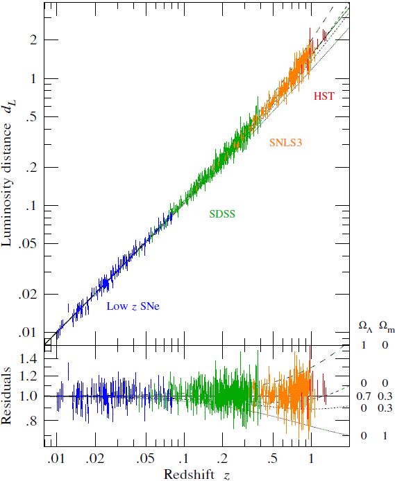 Hubble diagram of 740 Type Ia supernovae from a compilation of surveys, from data tabulated by Betoule et al. 2014. |